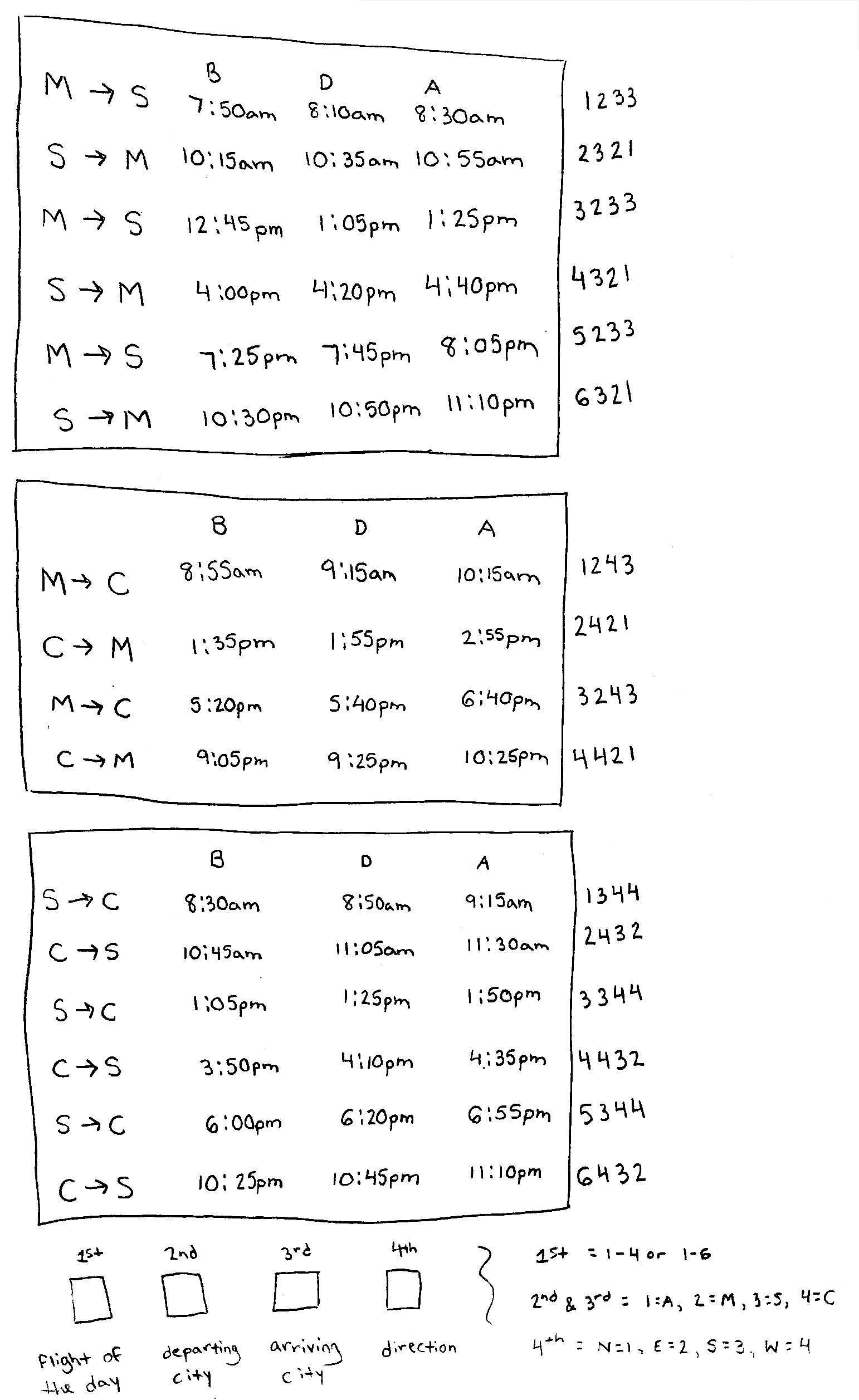 To ensure airports had non-conflicting flights to and from each destination, boarding, departure, and arrival times were predetermined based on the travel duration for each route.