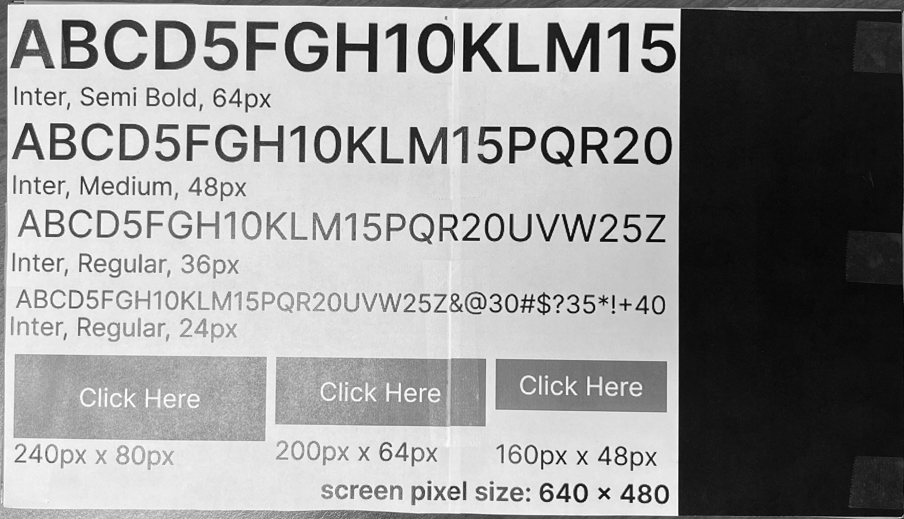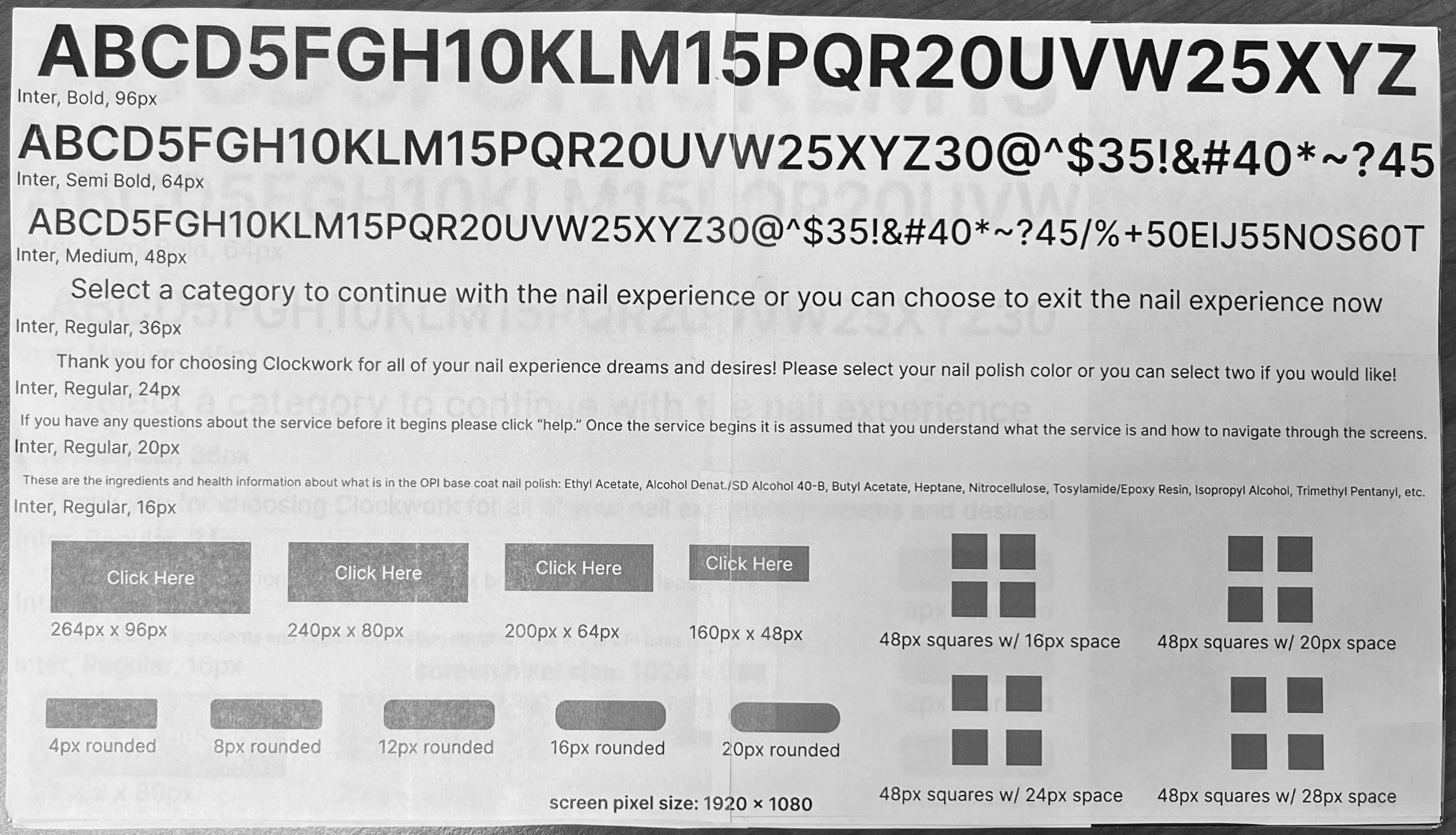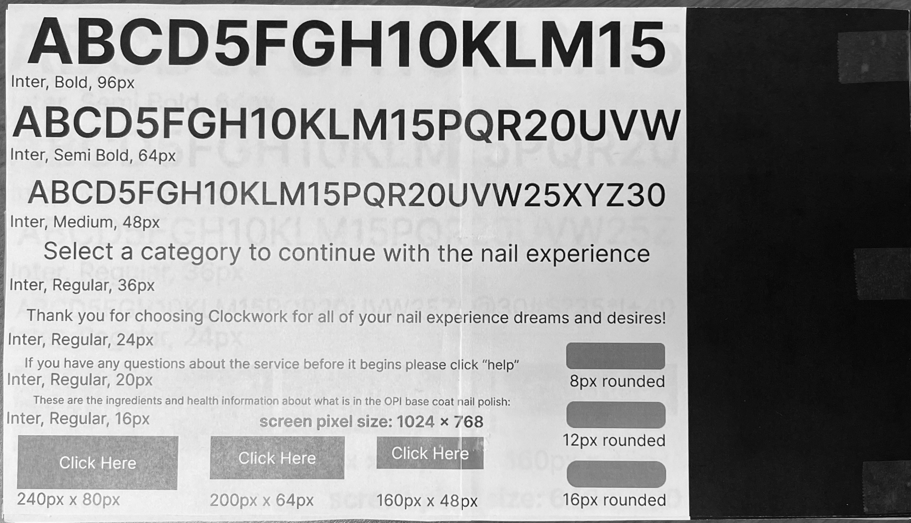 For mockups, I designed key interface elements and printed them at full scale to evaluate how they would appear and function on the kiosk screen. This process helped determine appropriate element sizing, touch targets, and the screen resolution best suited for user interaction.