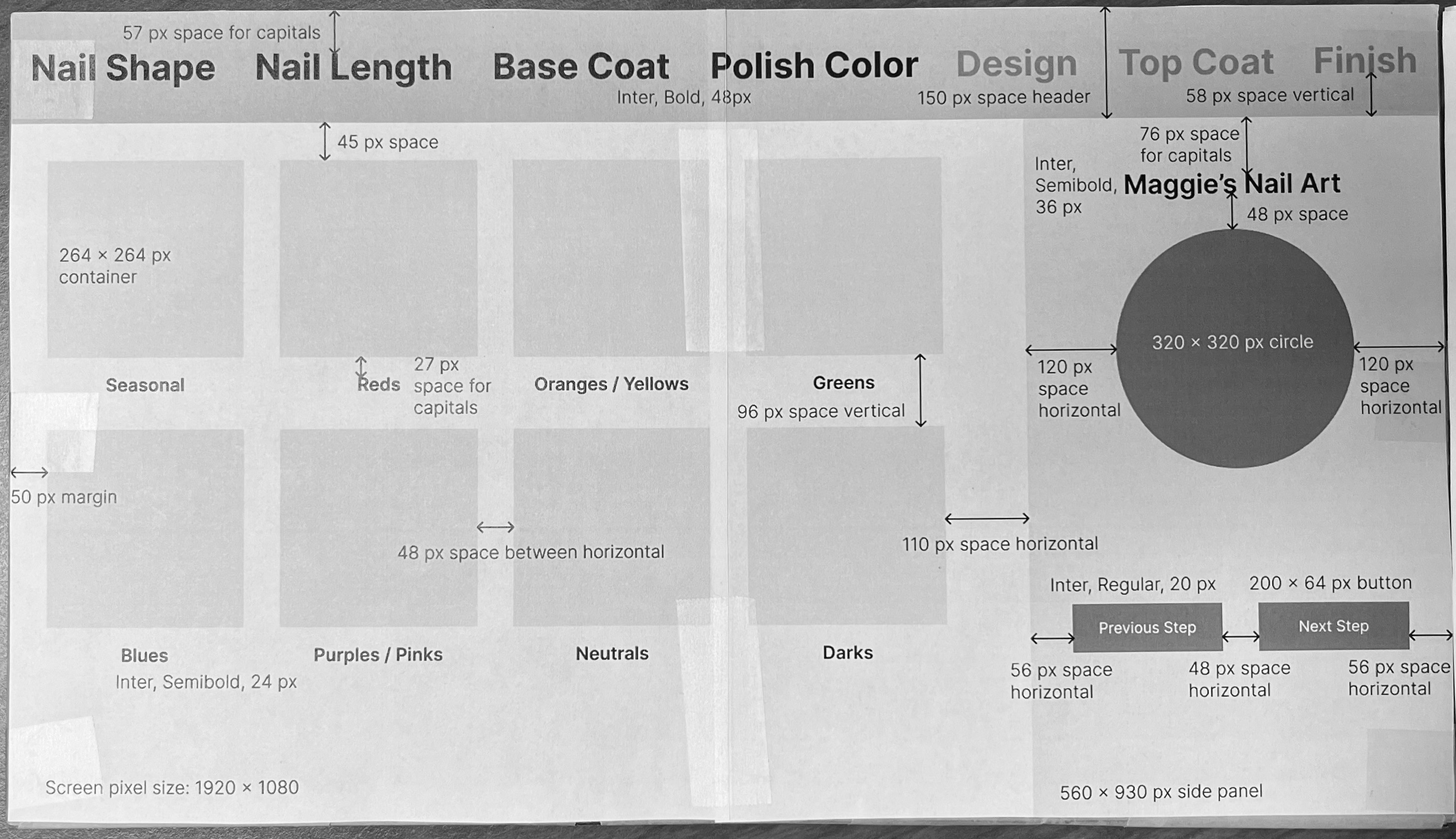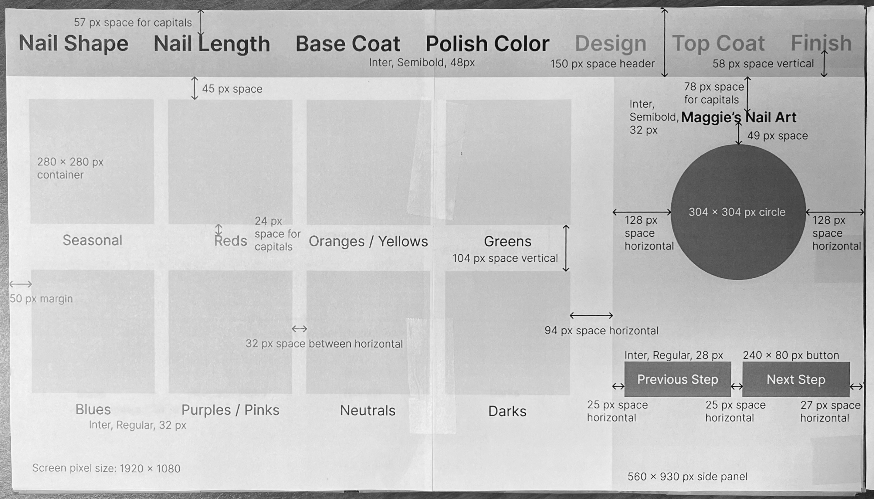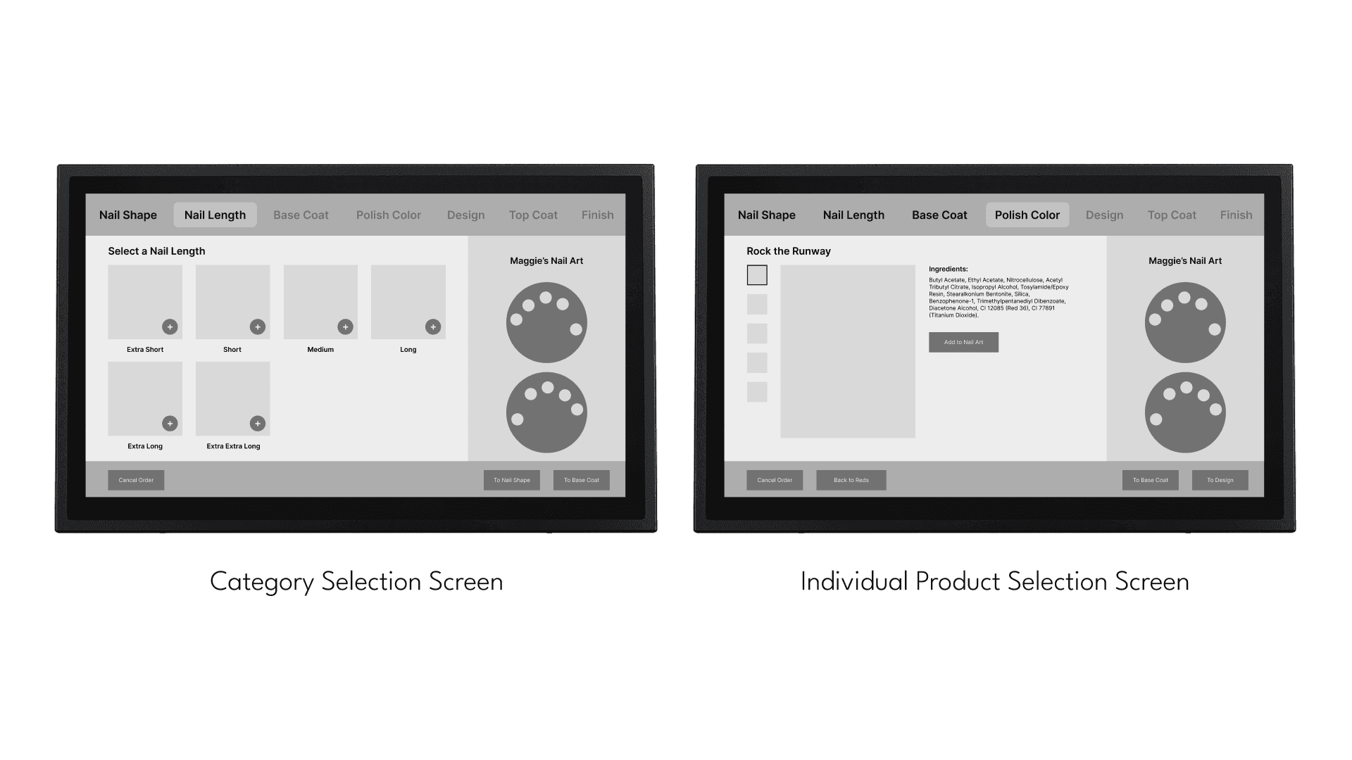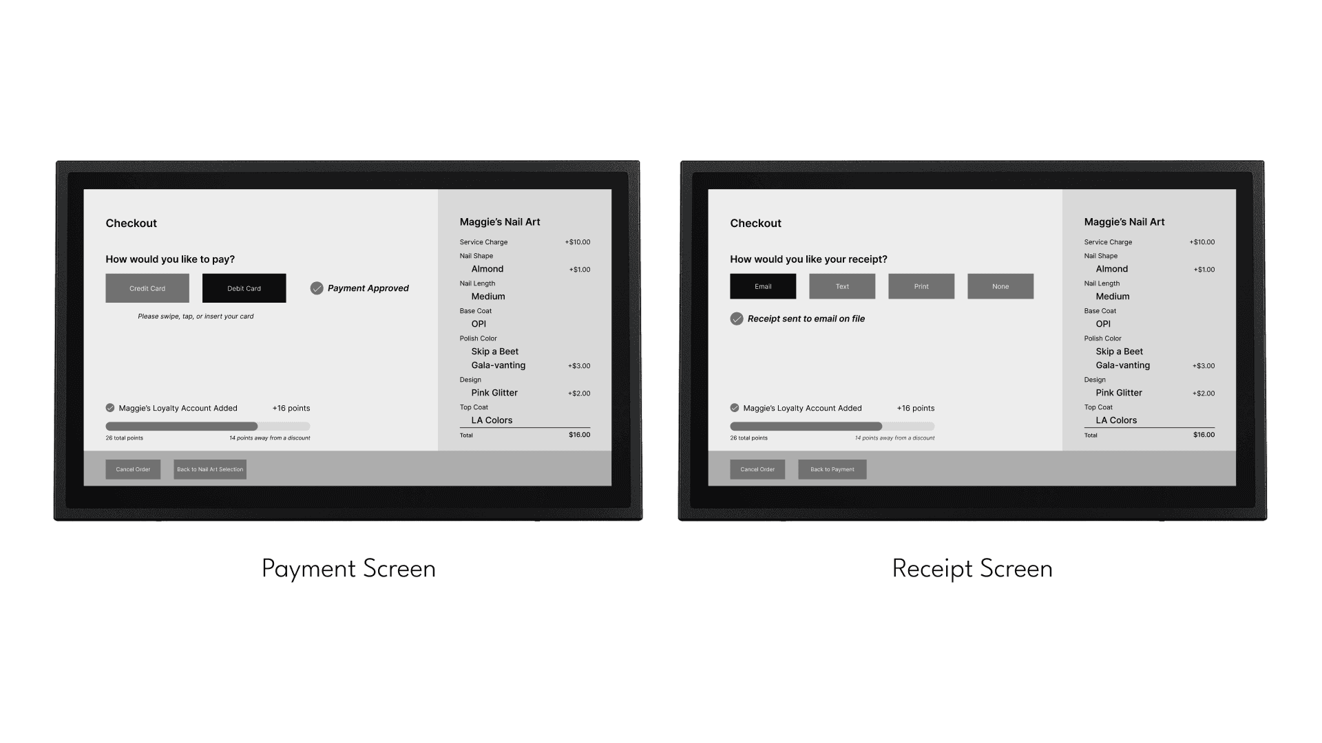 For mockups, I designed key interface elements and printed them at full scale to evaluate how they would appear and function on the kiosk screen. This process helped determine appropriate element sizing, touch targets, and the screen resolution best suited for user interaction.