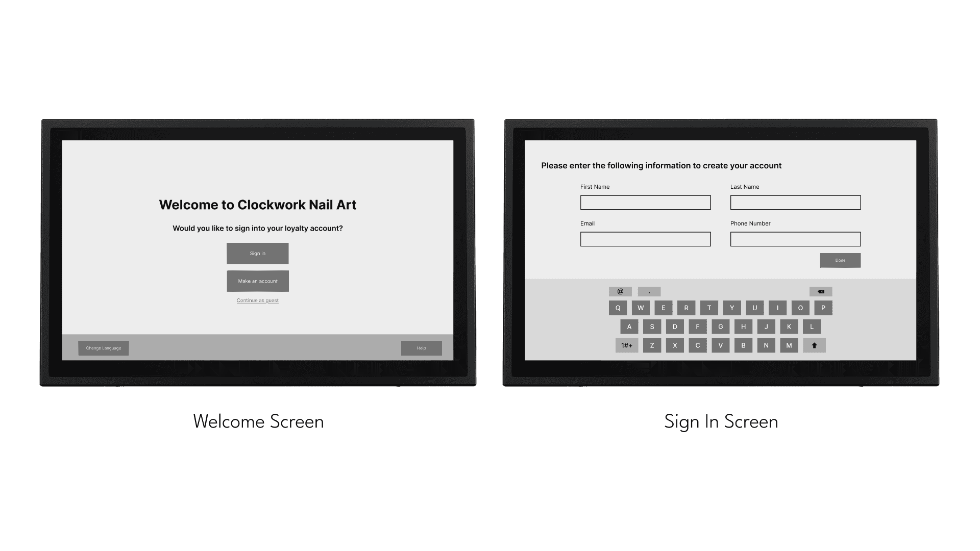 For wireframes and styling, I drew inspiration from Clockwork’s existing branding and the target audience through a curated moodboard. I also applied insights from the full-scale mockups to define spacing, proportions, and hierarchy, ensuring the layout was optimized for real-world kiosk interaction.