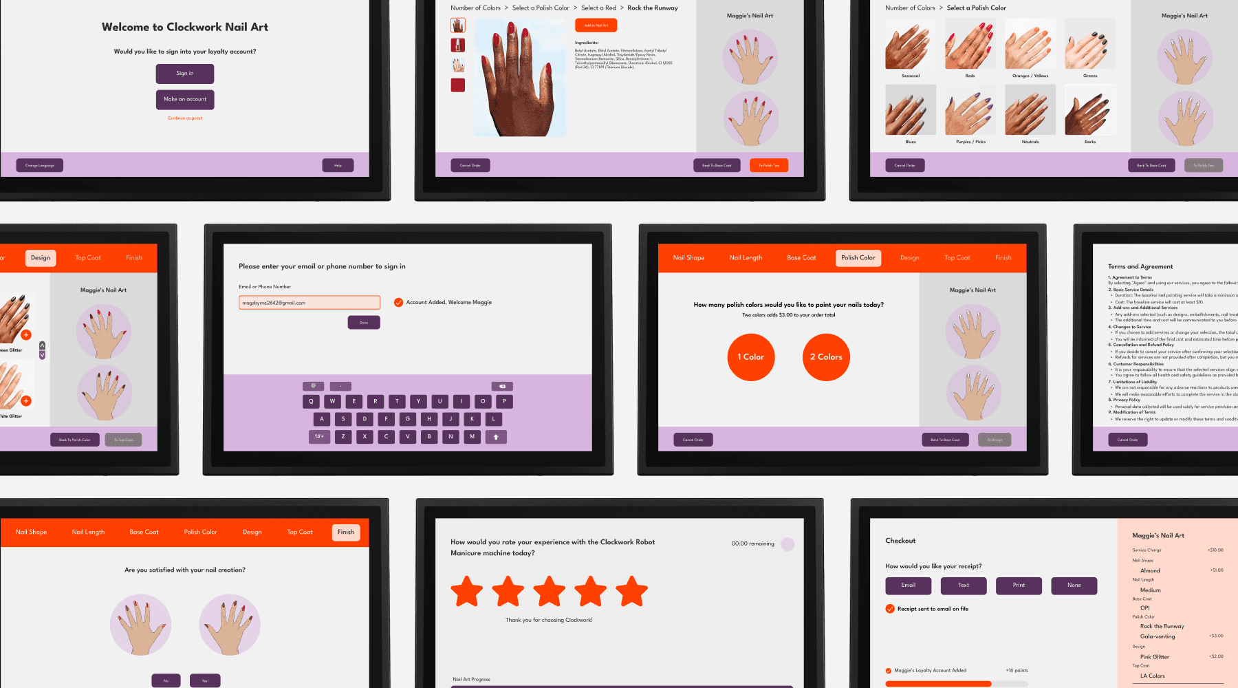 A robot nail art kiosk that lets users order and receive nail art from their seats, delivering a fast, seamless, and fully digital experience that elevates the brand, Clockwork and reimagines on-the-go beauty.