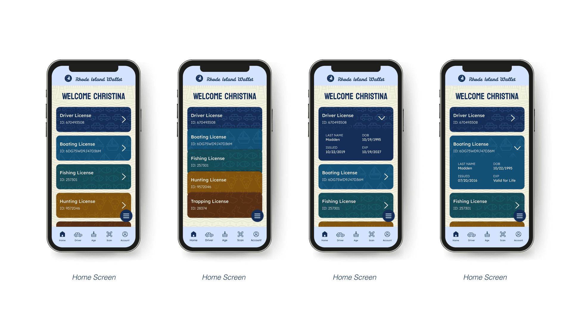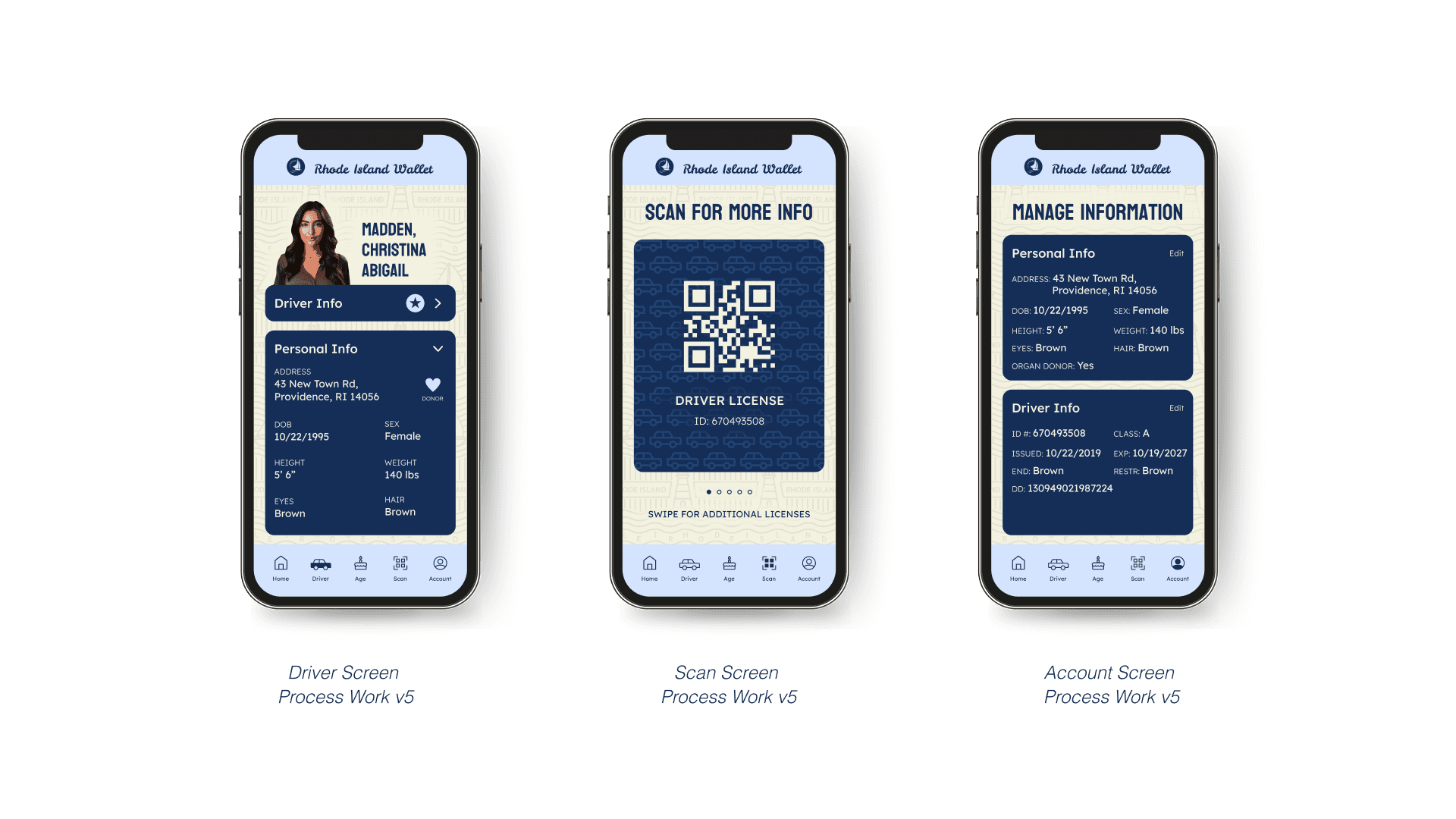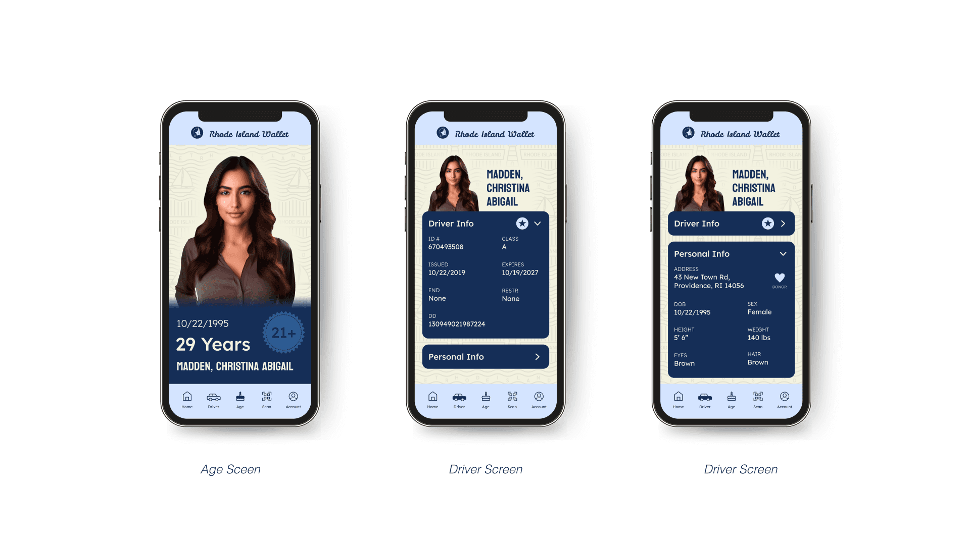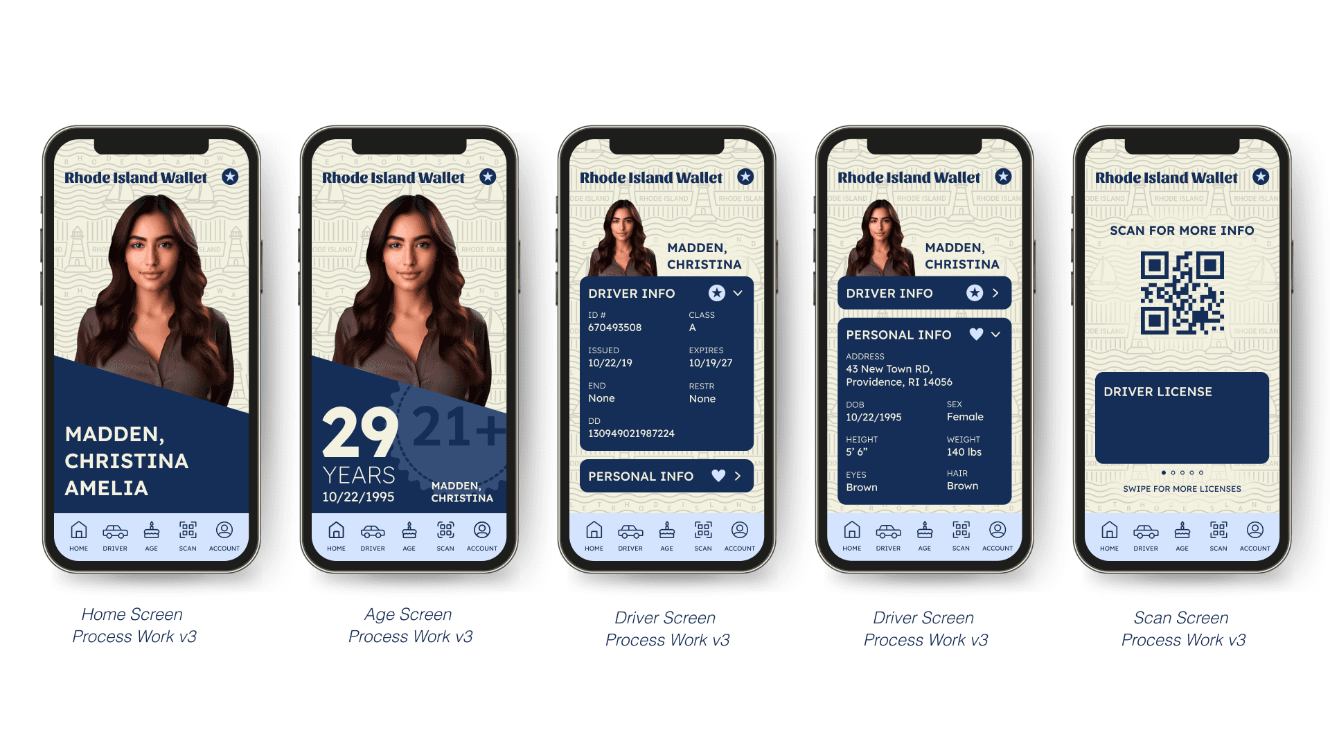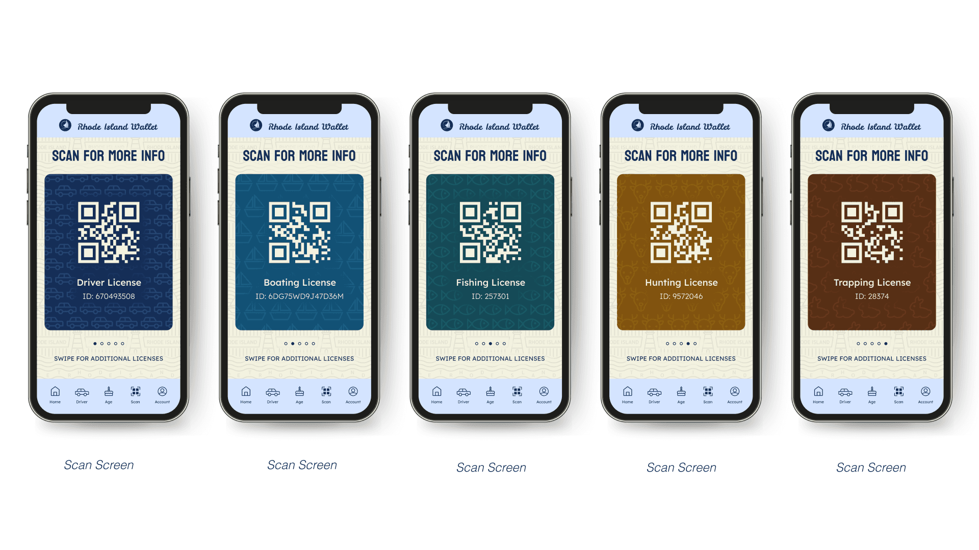 1) I designed a digital wallet app capable of housing multiple IDs in one centralized location. This allows users to easily access all of their licenses from a single interface.