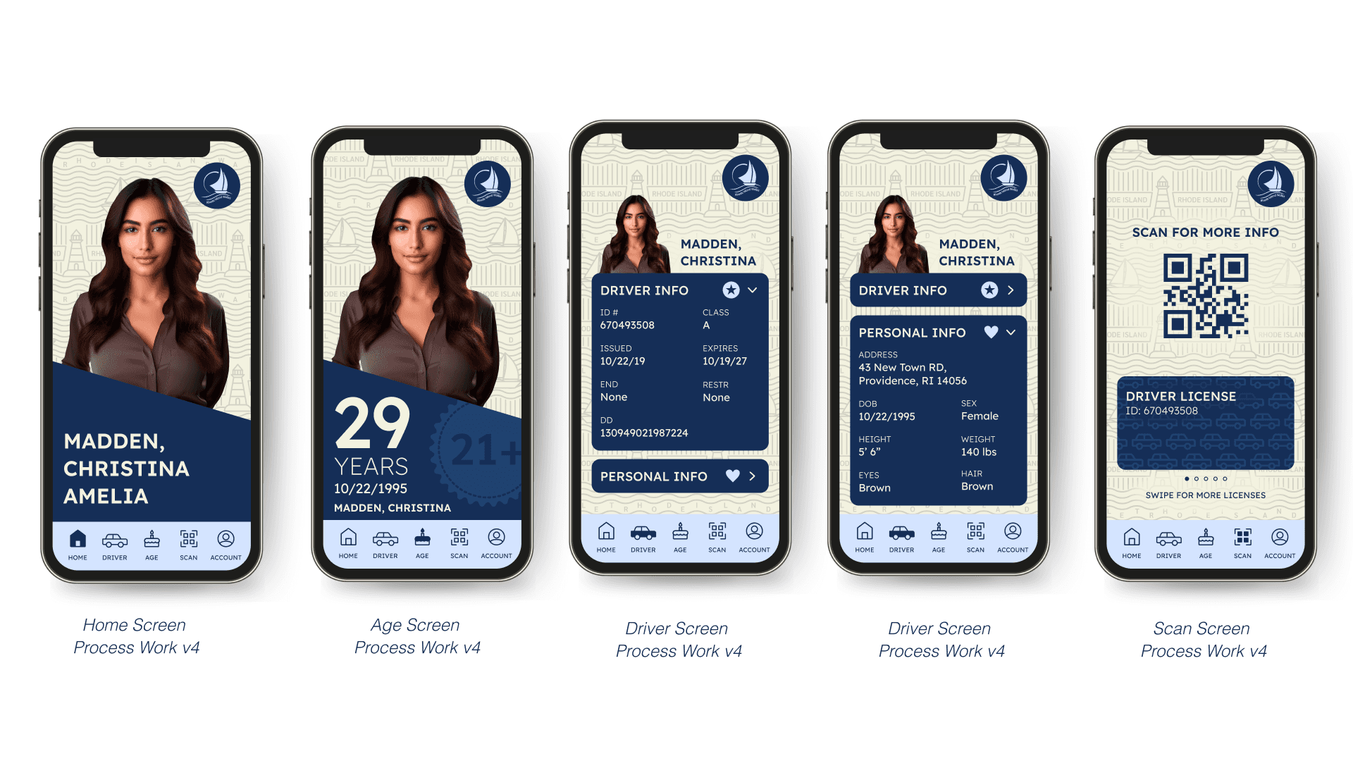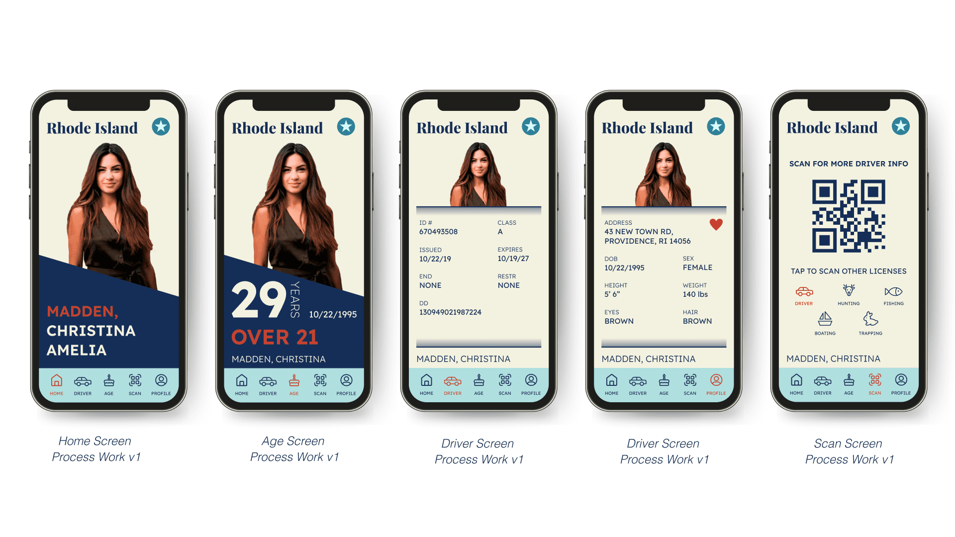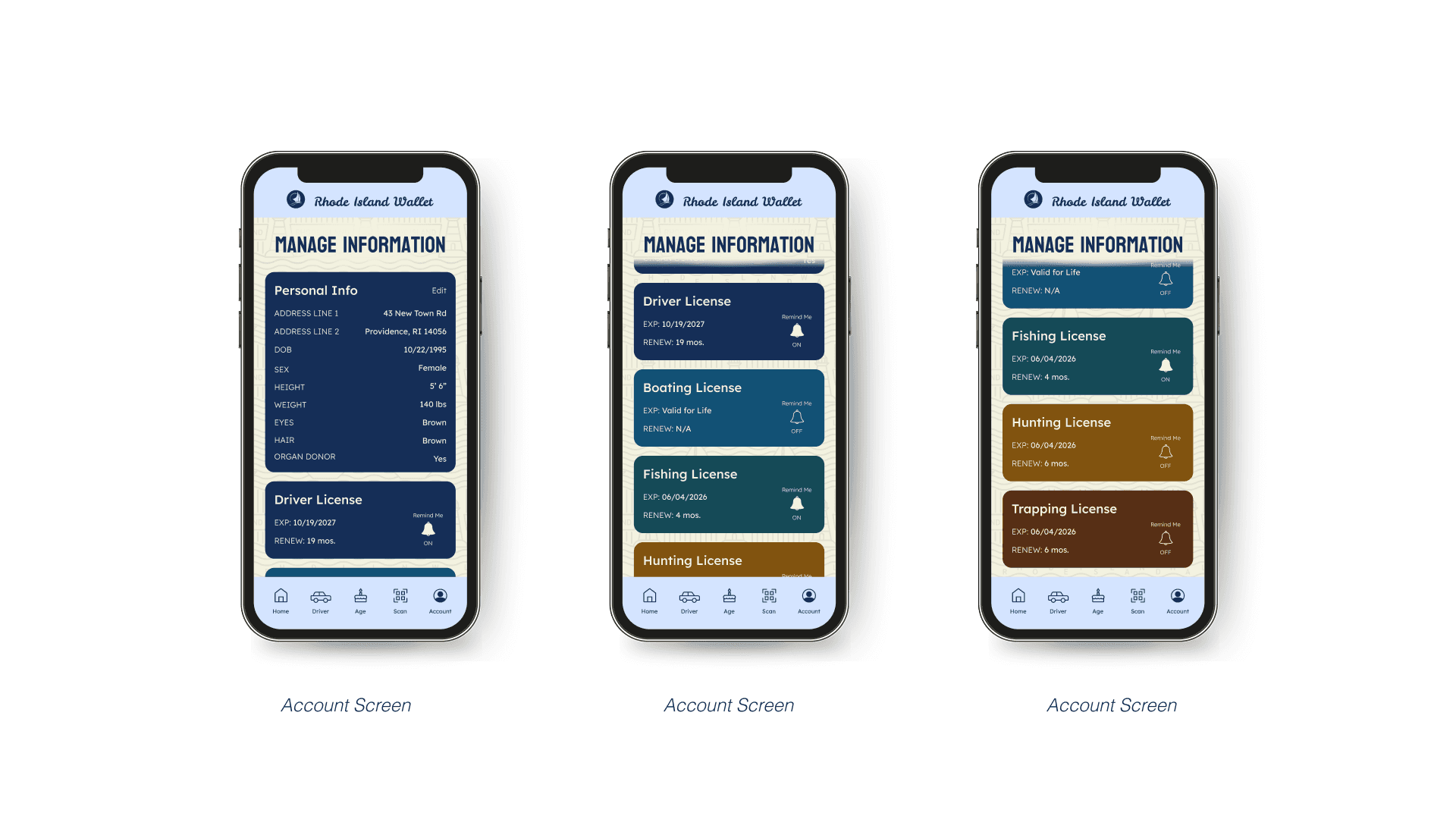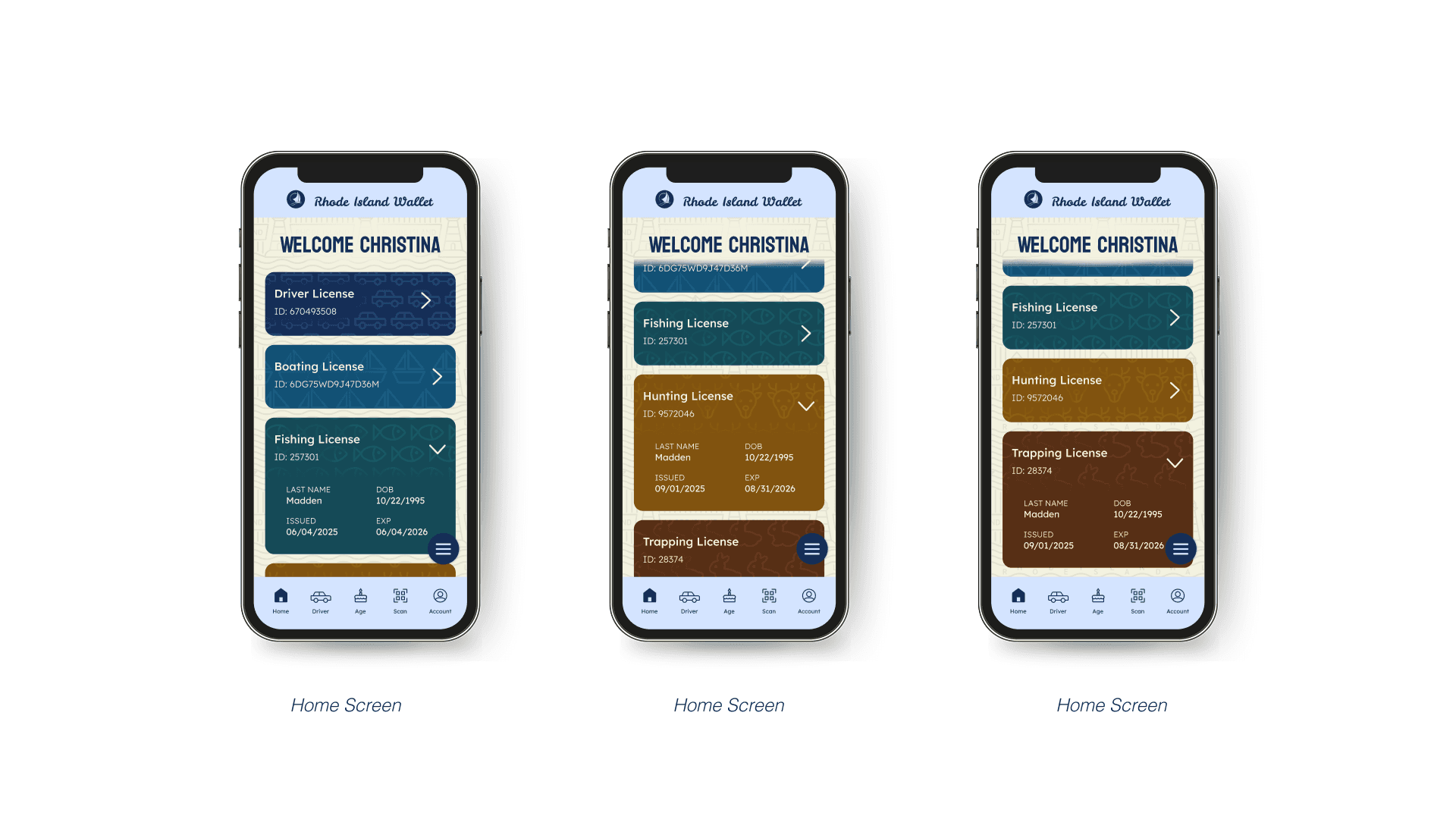 1) I designed a digital wallet app capable of housing multiple IDs in one centralized location. This allows users to easily access all of their licenses from a single interface.