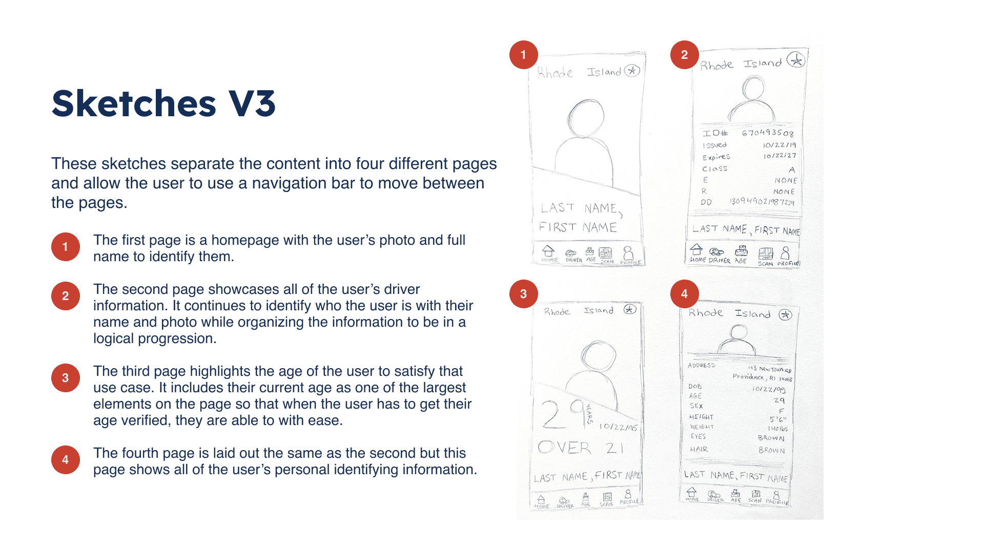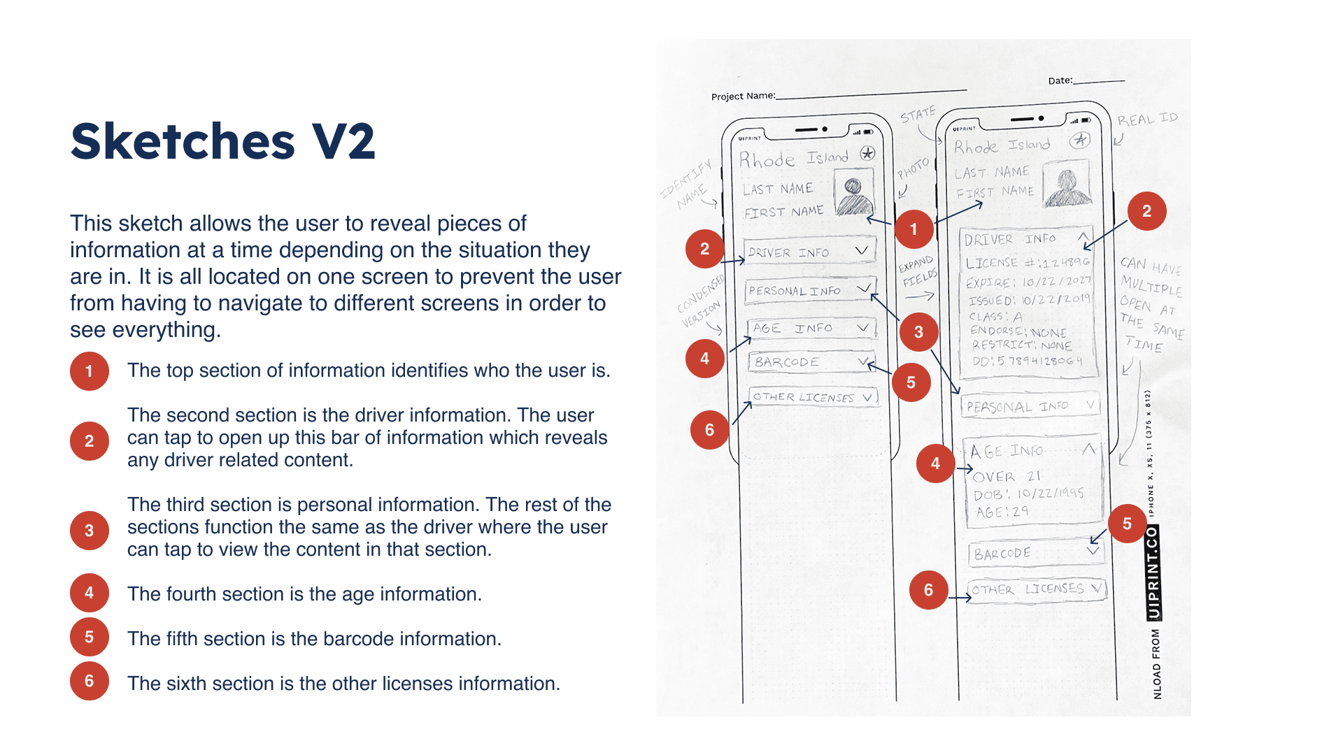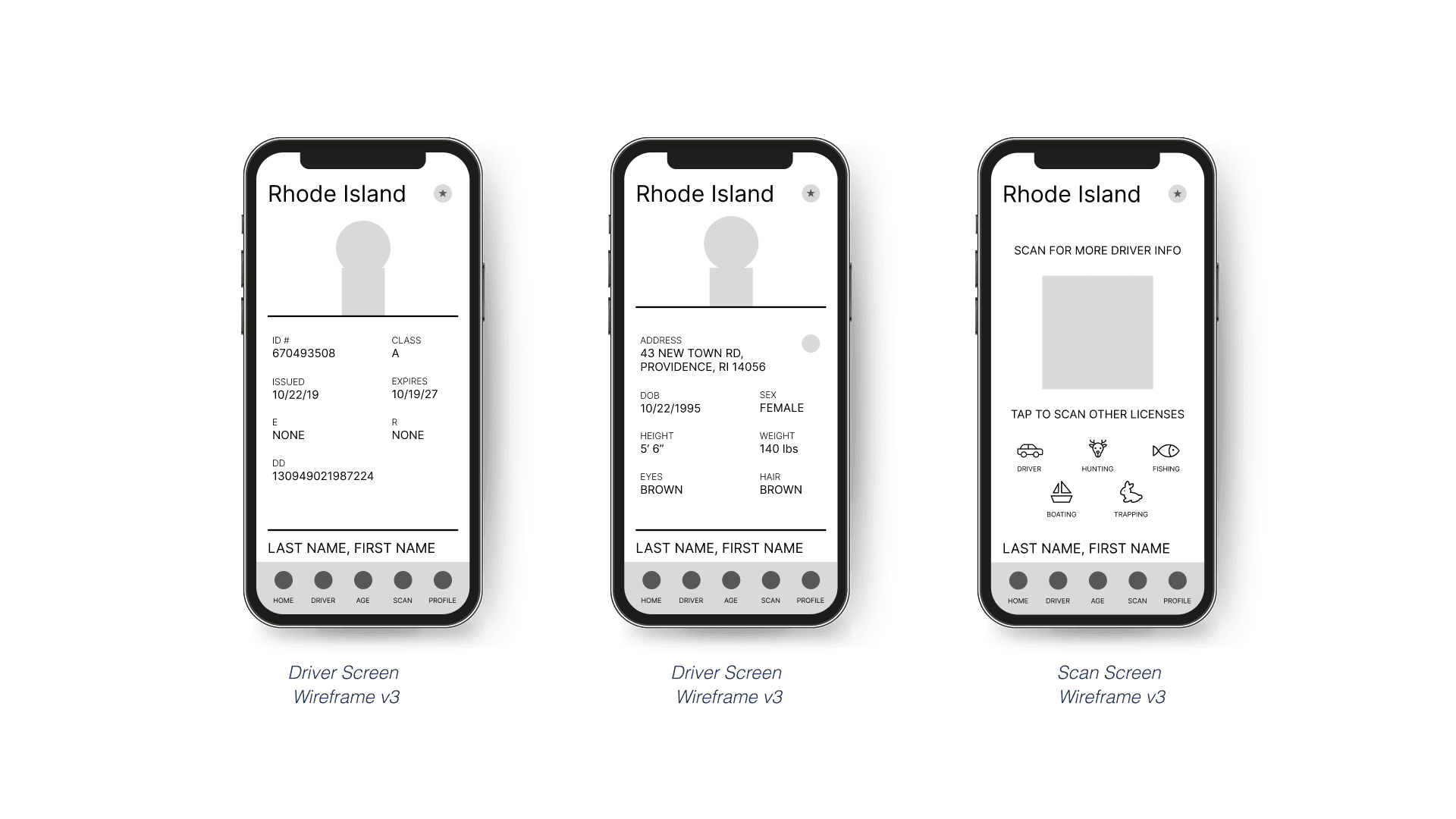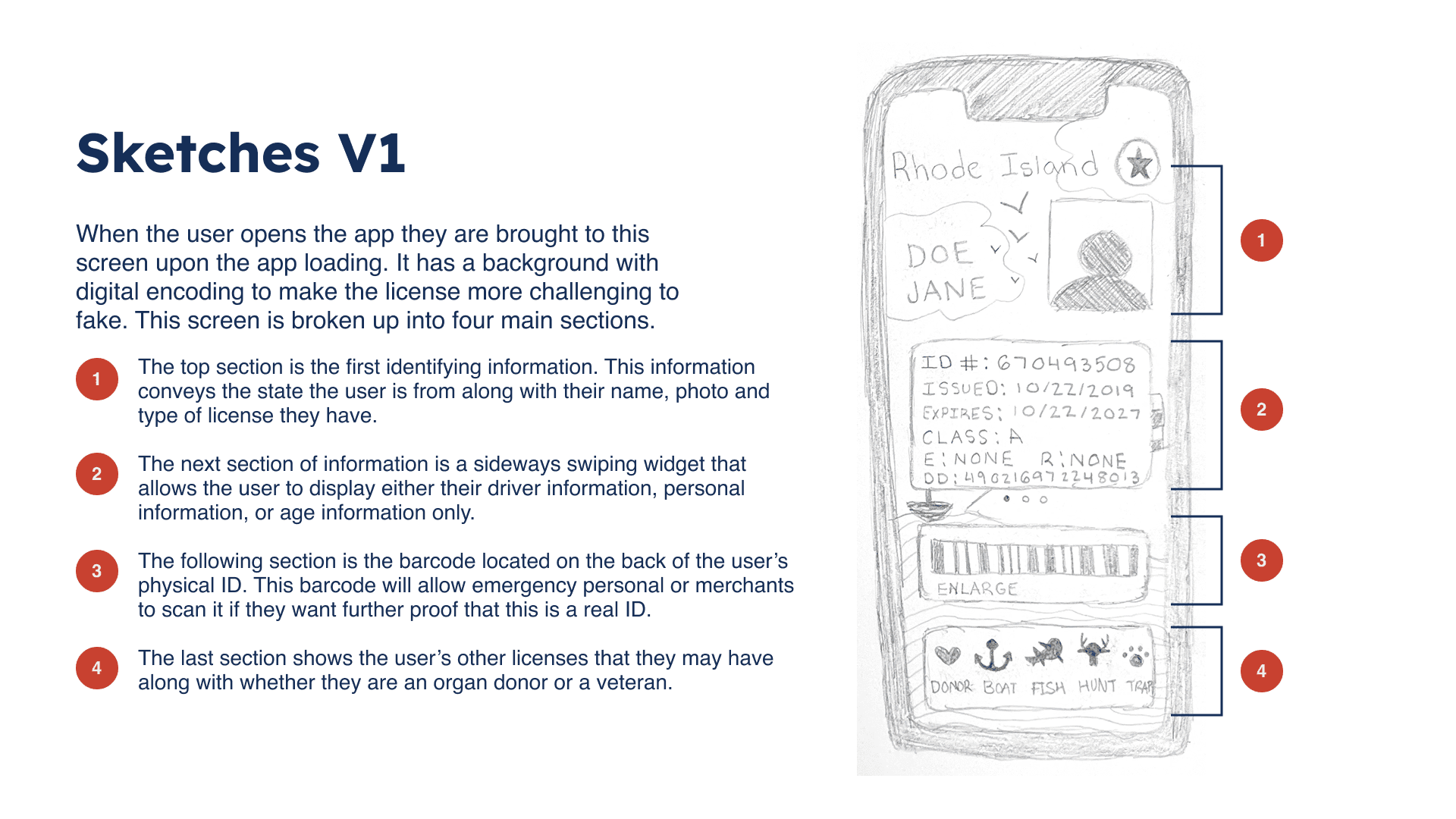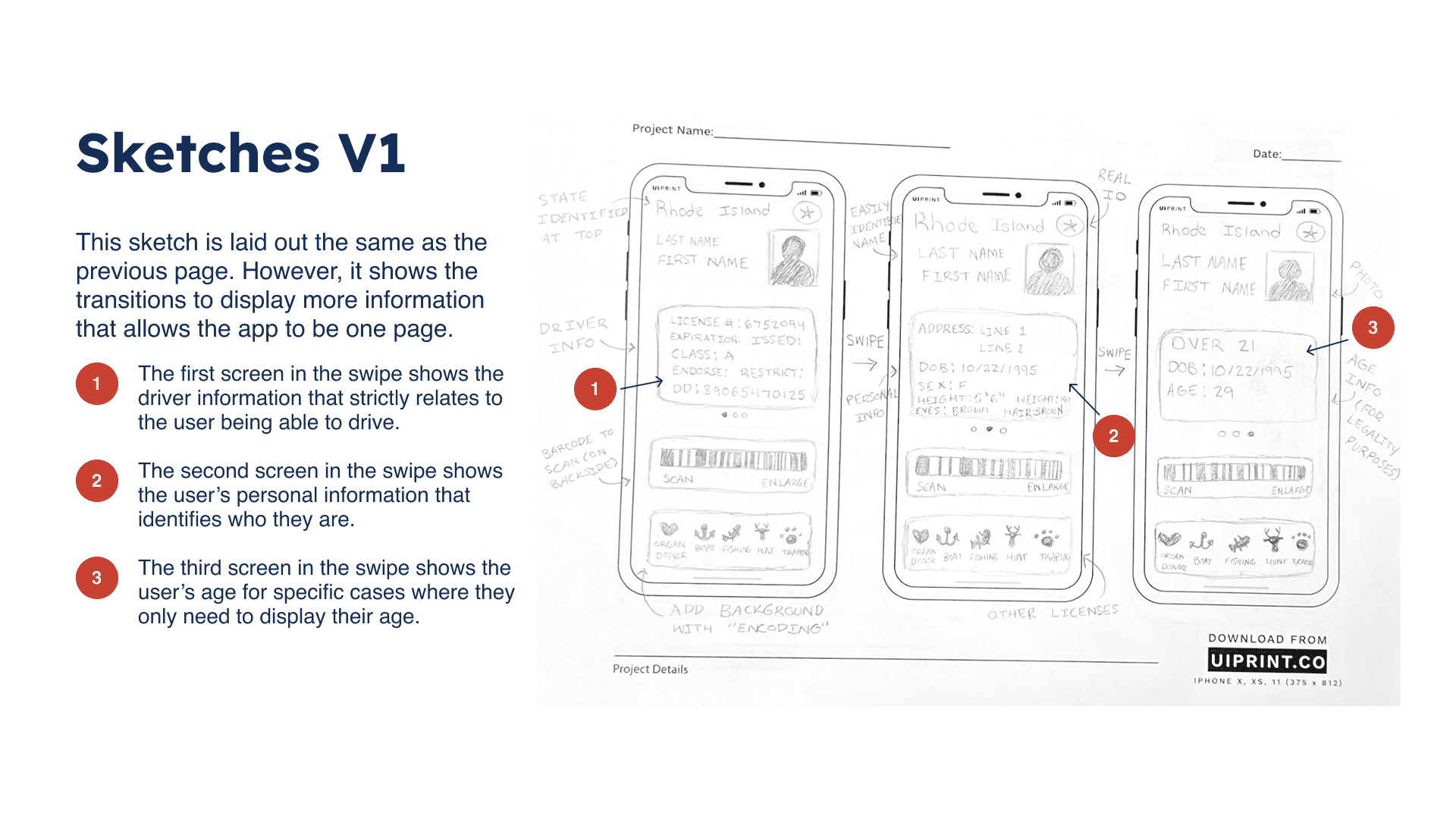 1) I designed a digital wallet app capable of housing multiple IDs in one centralized location. This allows users to easily access all of their licenses from a single interface.