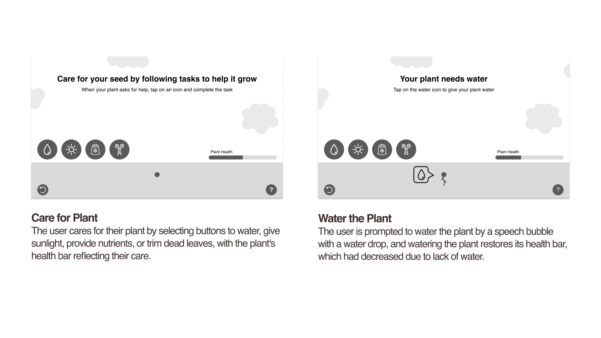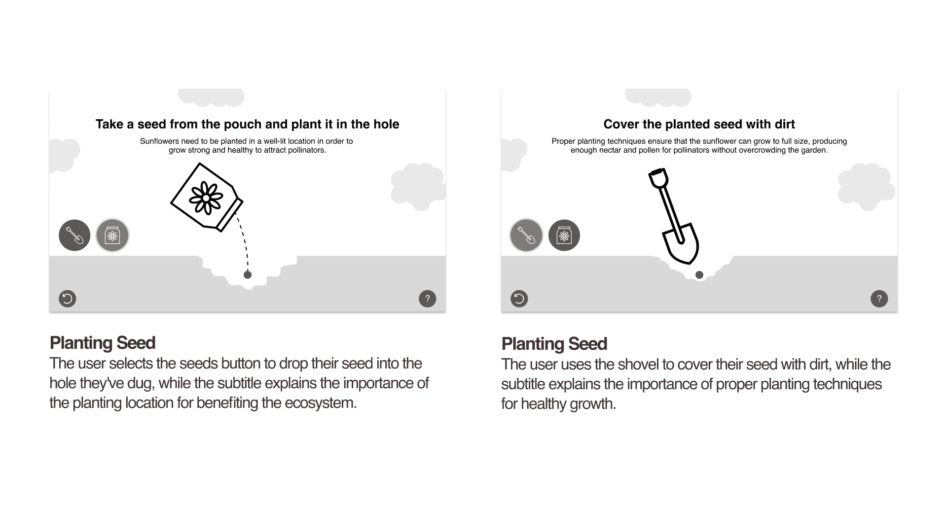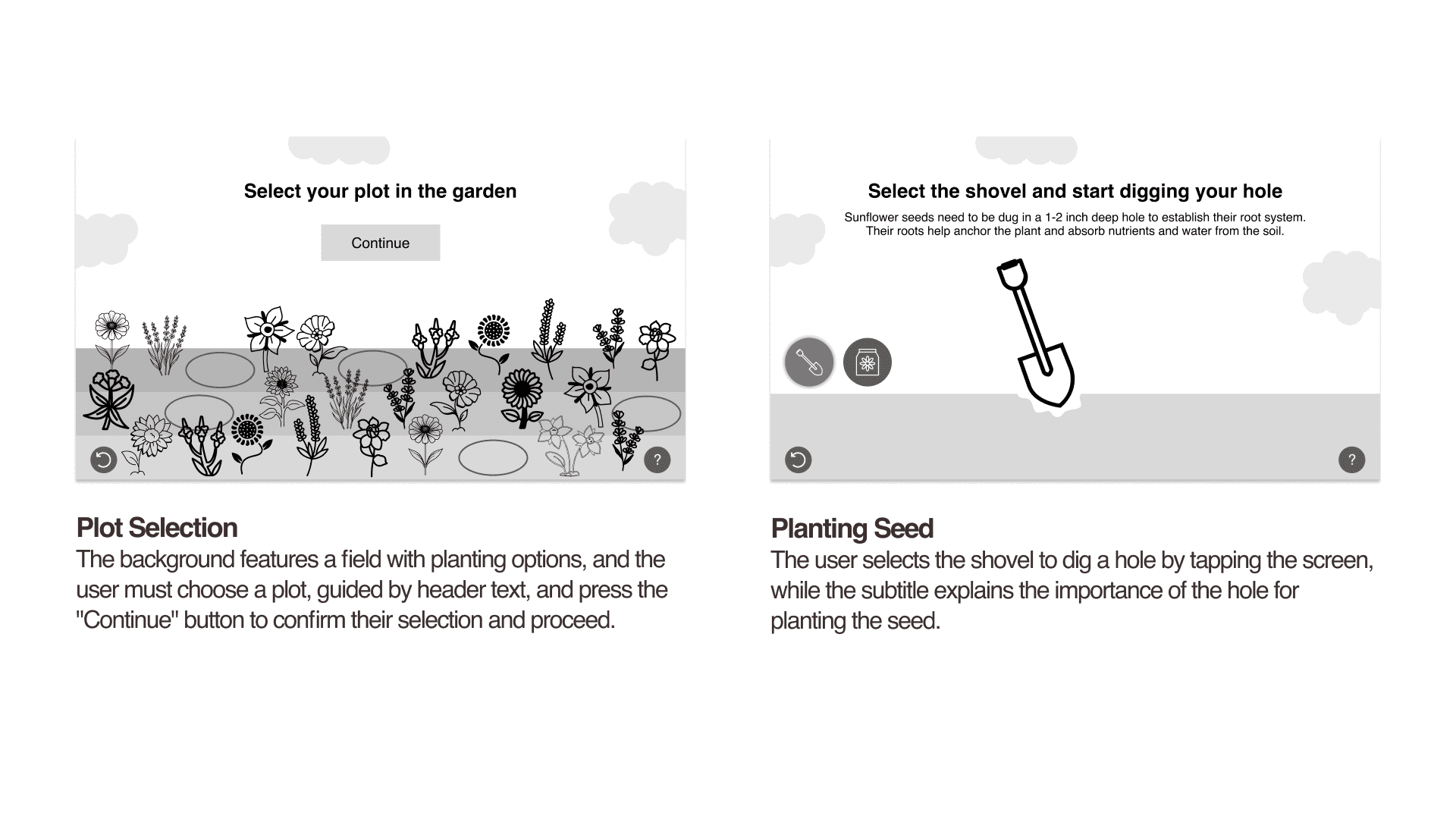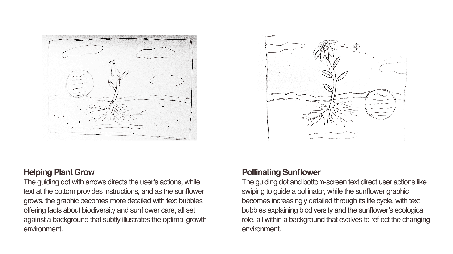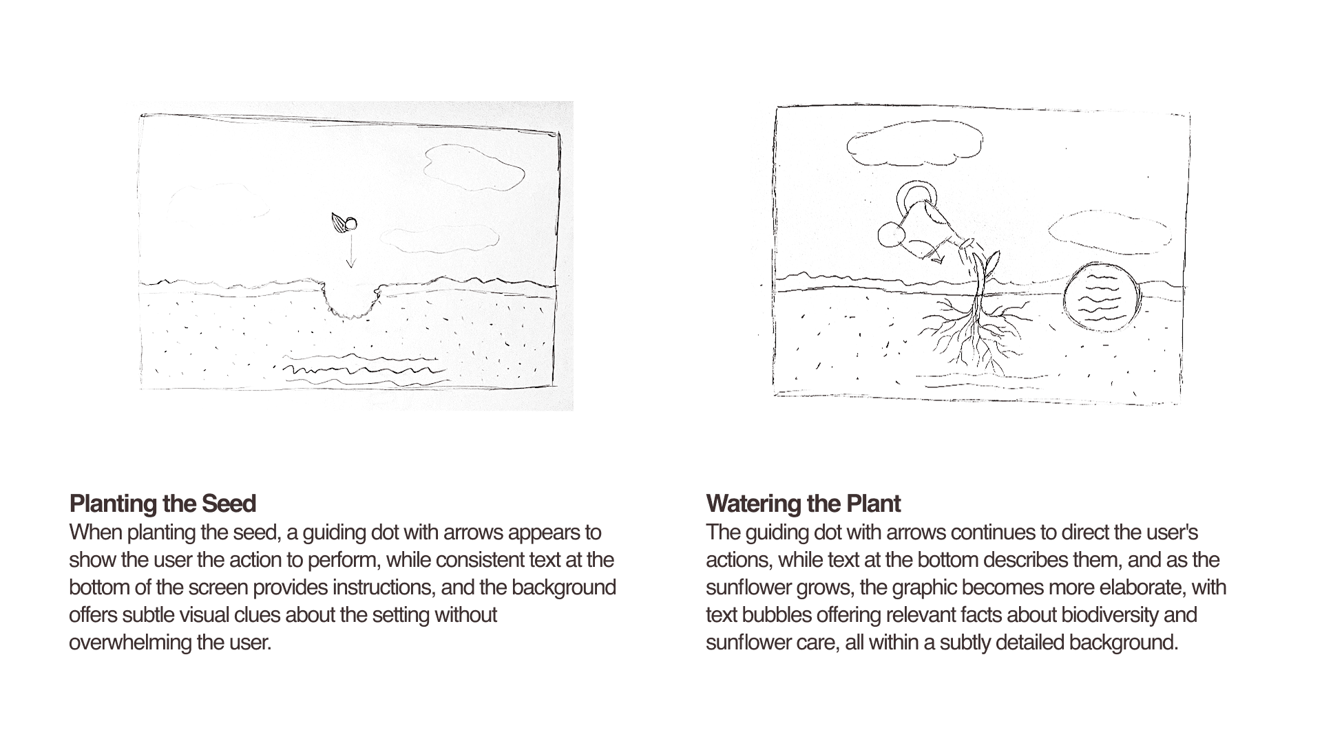 1) To address user disengagement, the experience will include elements such as a step-by-step guided journey for planting and nurturing the sunflower and gamification features, like progress tracking and rewards, to encourage repeated interaction.