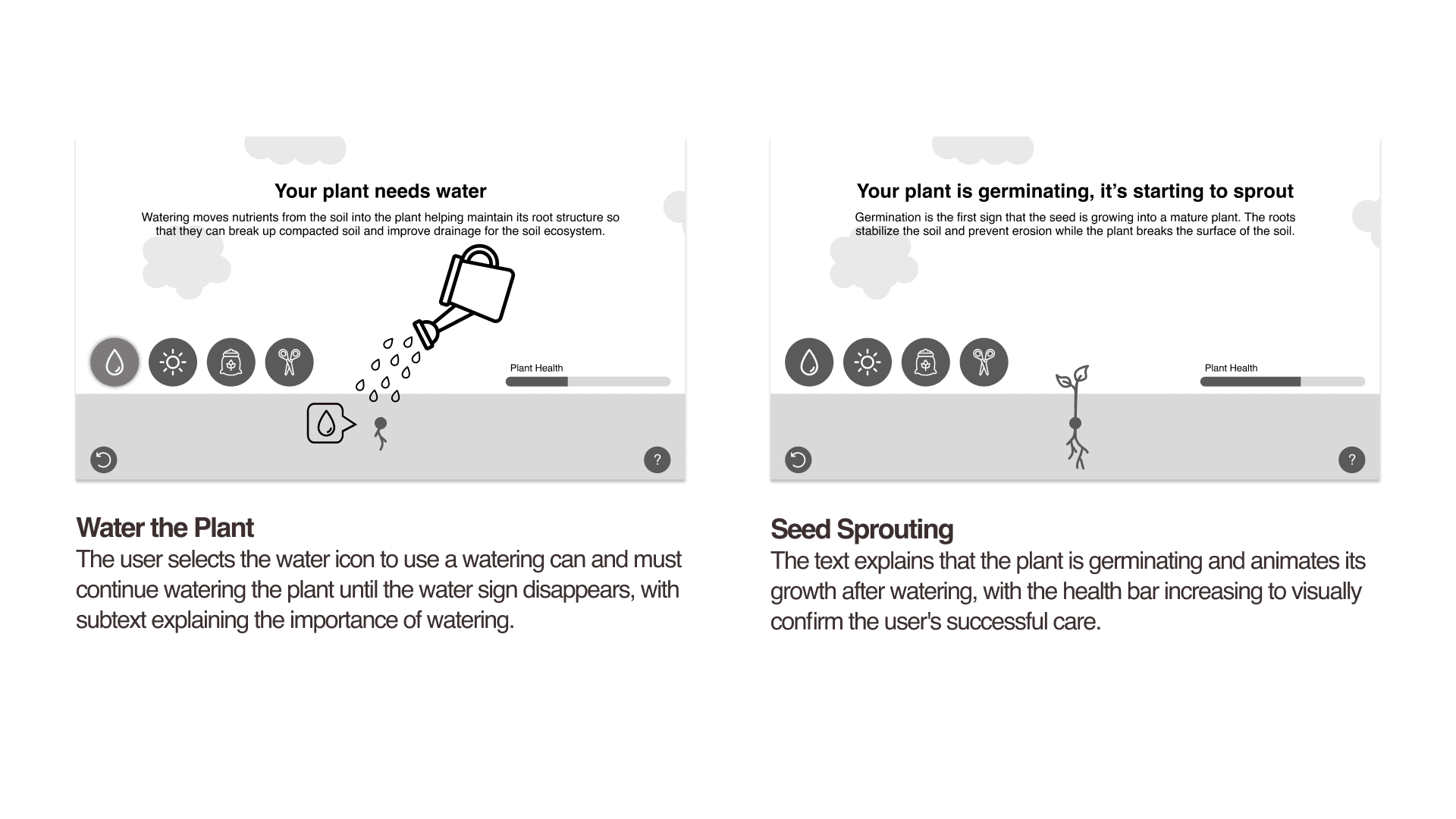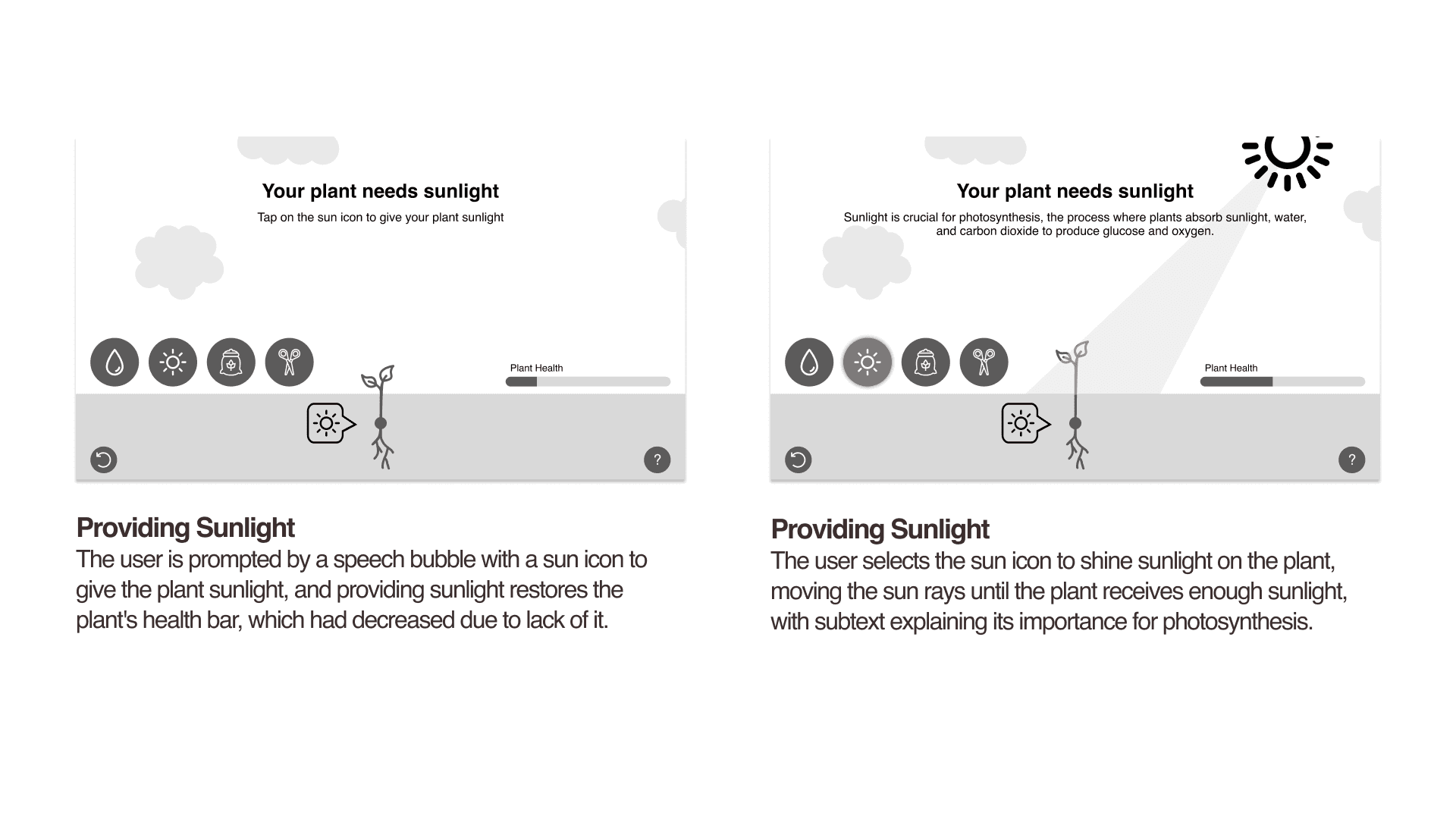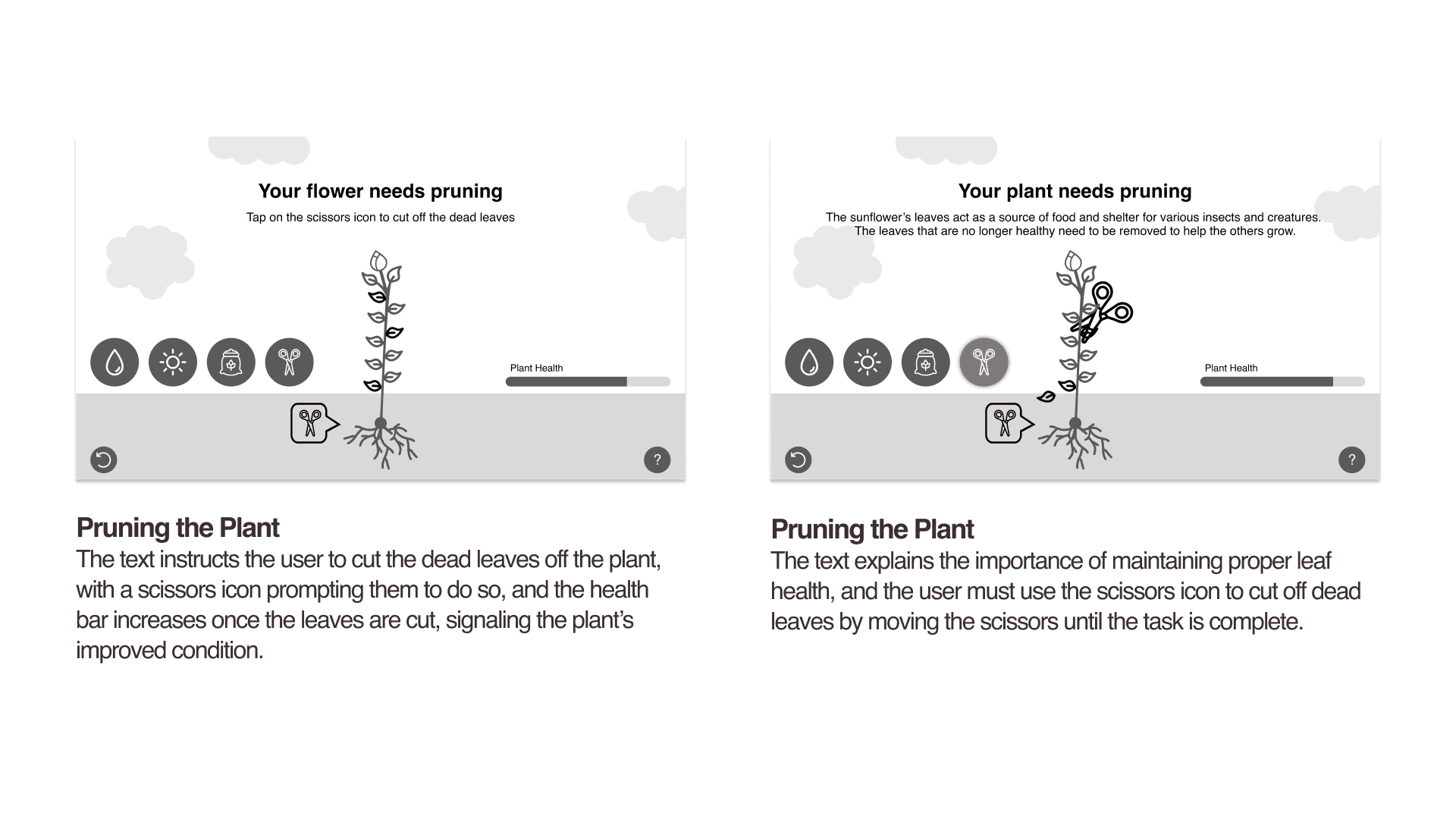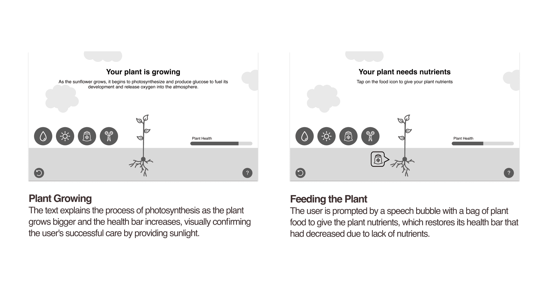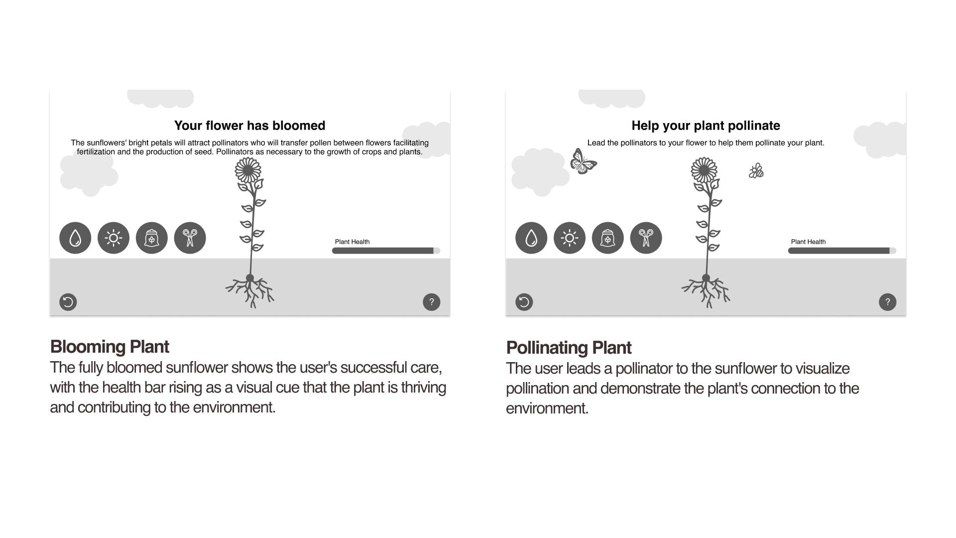2) Clear, visual feedback will be integrated after each user action, such as visual changes in the sunflower's growth to allow users to track their progress and motivate them to continue nurturing their plant.